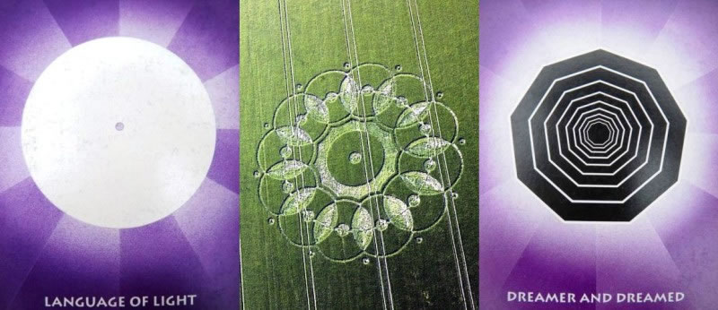 will try to make this lead in short (famous last words!)... Yesterday, June 3rd, I discovered that a crop circle had turned up in England that appeared to EXACTLY reflect what I'd spent 3 hours writing the night before, (off computer) June 2nd! It totally tripped me out because it reeeeally felt like we were speaking the exact same symbol language at the exact same time - connected! (co-creation at work?) Here are my edited ravings + some extra bits that I discovered yesterday as I was going through The Mayan Oracle cards to take a picture of the webby-looking card... When I first saw this crop circle this morning I said to myself, "Wow - those are all our Expanded Sun Selves! We've expanded so much that we are overlapping each other...totally connected...and forming the Vesica Piscis as we do so. THAT was the first thing. Then it dawned on me I had written about this last night! I was writing what is going to be a Note on "How Uranus and Jupiter conjunct in Aries is urging all of us to Self-Realize on a massive scale!" and in it are these words: "Maybe each of us, individually, will grow so big in our benevolence that we will start overlapping and create a whole new world with values that resonate with the new field we've co-created and tapped into?" Isn't that crazy!? I mean - it couldn't be more perfect! If I were to create a design to symbolically represent that concept this crop circle would be it! Sooooooo cool. But the coincidences don't stop there! The circles with the dot in the center are the exact astrological symbol for the Sun - who we are and who we are becoming. There are 12 Suns all linked up - when I see 12 displayed like that I automatically think of western astrology charts that are divided into 12 houses - each represented by one of the 12 astrological signs. The 13th in the middle blew me away because of my discovery a few years ago that one could overlay one's 13-day Wavespell onto the western chart - to glean more insight into oneself (a perennial navel gazer, I have to admit). In the Dreamspell/Mayan astrology there are 13 tones and we each get a personal 13 day Wavespell that happens every 260 days. Each of the days has a specific symbolic energy attached to it. SO - you can overlay the 12 days/tones/daykeepers onto the 12 house western astrological system and then, it felt quite fitting to me, to put the 13th tone/daykeeper at the very center of one's chart representing the energy of 13 which, in this system is: Surrendering to the Perfection of All That Is. (aaaah the ease of that eh?) It's kind of the summing up of ALL of you - it synthesizes all 12 houses/energies. SO - that tripped me out - seeing that in this crop circle, too! (for all your dreamspell lovers out there check out the 13th day of your Wavespell - see what daykeeper it is and see if it does really indicate an all-encompassing energy of your self that you surrender to) To top it off the Vesica Piscis has been a favourite symbol for a long time - I made it the logo for the crop circle t-shirts I created in 2002 - it was on the back of every t-shirt! But that is not all (I sound like a salesman, I know, but I'm just excited) - the last symbol that I am really familiar with and that goes with the theme is the spider-like web shape in the middle. This is the symbol for one of the Lenses in the book The Mayan Oracle (which I work with a lot). The book has descriptions (and cards) of the 20 Daykeepers, 13 Tones and 11 Lenses. This spider-web Lens is called: Dreamer and Dreamed (oooh don't you love that??) Then, yesterday as I was taking a photo of the card for this image I came across another Lens which is the Sun/Self lens! Ahhhhhhhh- HA! Two messages here for everyone, I thought! This Lens is called The Language of Light (which is, actually, the language that the whole book, The Mayan Oracle, is written in - there's a big introduction about this in the book) SO, I really feel that one of the reasons I had all these resonations with this crop circle is to share the messages of these two cards with you! It's kinda llike a cosmic crop circle tarot card reading for all of you, isn't it!? Language of Light: This lens heralds your approach to an interdimensional gateway. Be watchful - the language of light, the energy of your God Self, is assisting you in the crafting of your light body. This loving creation occurs through subtle transmissions of energy that can be sensed as pulses of light, colour, sound, or heightened vibration. Trust and develop this sacred language. It is encoded in your feelings. You will know when you have been touched by this abstract language when you have a sudden sense of union, transcendence, or expanded perception (Jupiter conjunct Uranus in Aries June 6/7th!). Learn to use your feelings as your spiritual steering mechanism. Let your heart be your compass. Allow this ancient mode of communication to spark memories of your purpose and destiny. Symbols act as a means for decoding this abstract language. You do not have to "understand" symbols; their meaning affects you on a supraconscious level that permeates all aspects of your being. Rather then relying on meanings fixed in memory, be receptive to your innate responses to symbols and metaphors. Let them ignite your own mythic coding, acting as a "rapid transit" between realities. Colors are also part of this language. Notice and work with the colors that strongly attract you. Remember, you are the knower. Fly into the pure state of consciousness where there are no words. Open to receive your native tongue, the galactic language of light. Feel the pulse of reunion, lovingly tendered as a gift of grace. Dreamer and Dreamed: