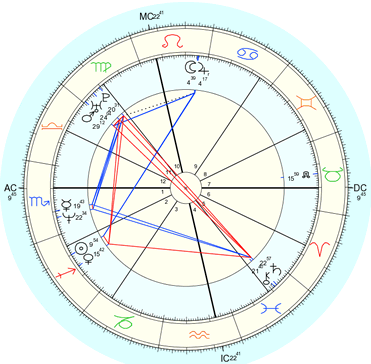The planets in black inside the ring are how the planets were situated in the night sky the moment you were born. The blue and red lines that connect your natal planets show the dynamic tension and challenges (red lines) and the easy, harmonious (blue lines) energies at play in your chart.